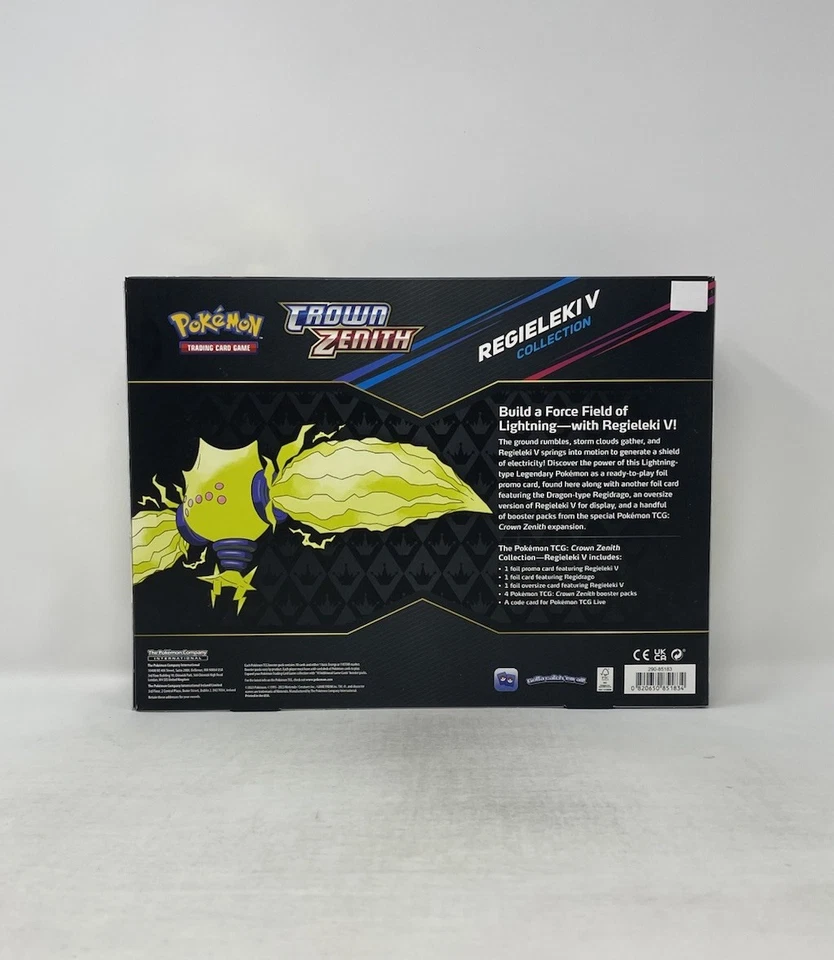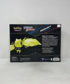 Die crown zenith regieleki v collection präsentiert die Kraft zweier Legendärer Pokémon aus den eisigen Regionen der Galar-Welt. Regieleki V steht hier als dynamischer Fokuspunkt im Mittelpunkt und wird von einer Oversize-Version begleitet, die sich ideal für Sammler eignet. Zusätzlich liegt eine weitere Foilkarte bei, die das jeweilige Gegenstück – Regidrago oder Regieleki – zeigt.